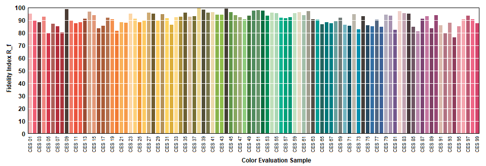 TM-30-15 Rf waardes voor 99 samples voor het licht van deze lamp. Wanneer deze de waarde 100 dicht nadert, betekent het dat de kleurweergave dichtbij die van de referentielamp zou zijn.