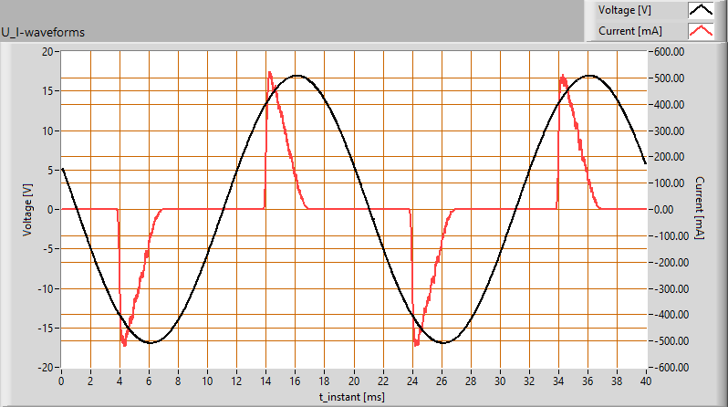 De inschakelstroom is gemeten voor de verschillende starthoeken van de spanning van 0 – 170 graden (met stap van steeds 10 graden). De stroom- en spanningswaardes zijn met een acquisitiefrequentie van 39.9 kS/s binnengehaald. Daarna zijn de meetresultaten door een 2e orde 2kHz laagdoorlaat Butterworth filter gehaald. Hiermee worden zeer kortdurende, niet relevante, (stroom)pieken weggefilterd.