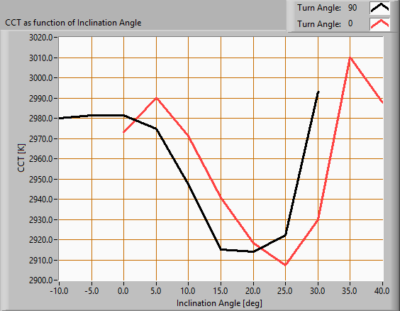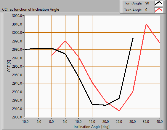 Voor het C0-C180 vlak: kijkende naar de stralingshoek van 48 graden dan komt dit overeen met 24.2 graden kantelhoek, dit is het gebied waar het meeste van het licht afgegeven wordt. De maximale variatie in kleurtemperatuur in dit gebied (kantelhoek) is ongeveer 2 %.