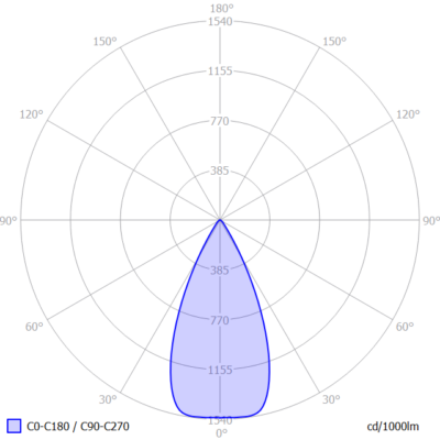 Het lichtdiagram geeft een bundel aan in het C0-C180 vlak en in het 90 graden loodrecht daarop staande C90-C270 vlak. Deze zijn gelijk vanwege de symmetrie over de 1e as (de verticale as).