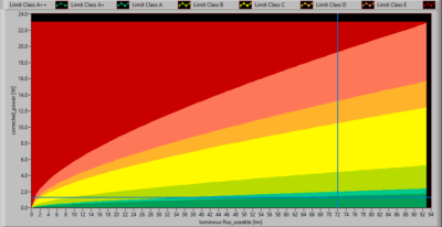 Het lichtpunt ligt binnen het gebied aangeduid met klasse B. De gebieden A en B gelden voor signaallampen.