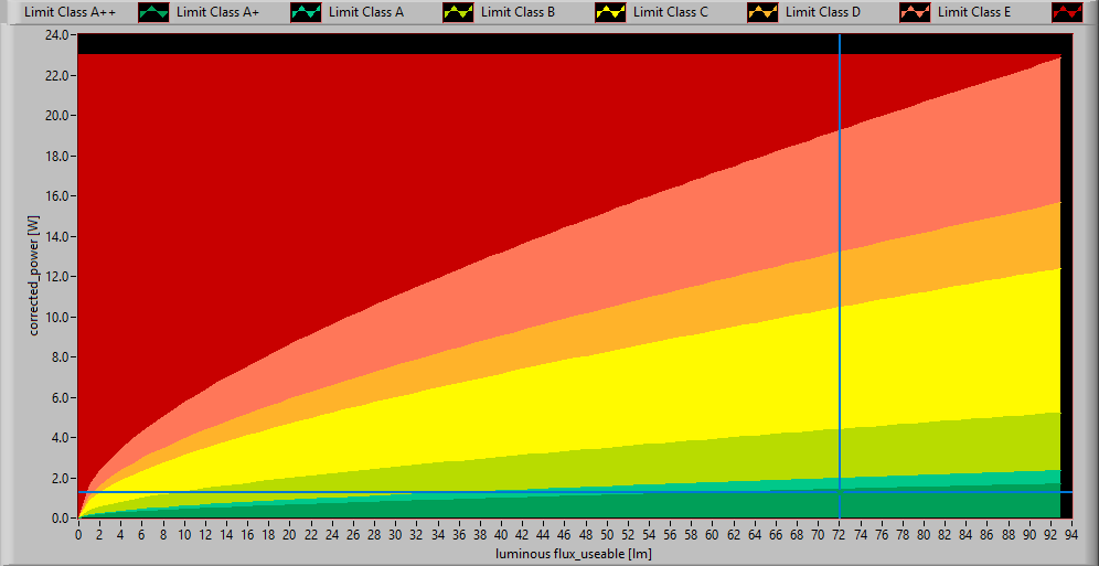 De energie-efficiëntieklasse van lichtbronnen wordt bepaald op basis van het totale netspanningsrendement etaTM. Dit wordt berekend door de opgegeven nuttige lichtstroom (72 lm, lichtstroom in een smalle kegel (90°)) te delen door het opgegeven elektriciteitsverbruik in gebruiksstand Pon (1.2 W) en dit te vermenigvuldigen met de toepasselijke factor FTM die afhangt van het type lichtbron (1.089, type: Gericht (DLS), niet werkend op netspanning (NMLS)). Het resultaat is het totale netpanningsrendement etaTM = 68 (lm/W).