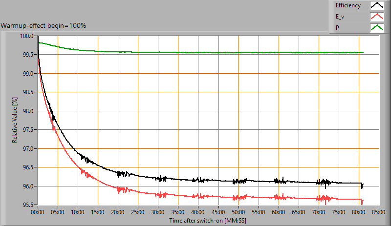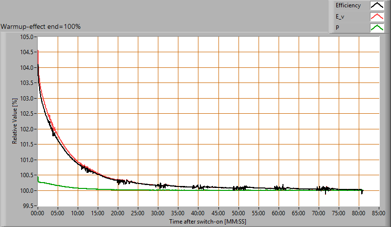 De variatie in efficiëntie (hier indicatief berekend door deling van verlichtingssterkte door vermogen) door het opwarmen is -4 %. Een erg hoog negatief getal duidt op een significante afname door bijvoorbeeld warm worden van de lichtbron (lagere levensduur).