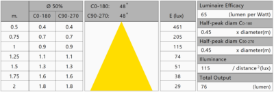 Bij het berekenen van de lichtsterktewaarden per hoek en deze uit te zetten in een grafiek, is de stralingshoek te bepalen: dit is berekend op 48 graden voor het C0-C180 vlak en 48 graden voor het C90-C270 vlak.