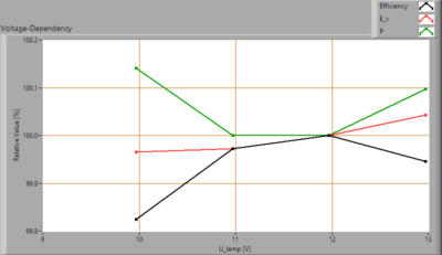 De lamp is onderzocht op hoe afhankelijk de parameters verlichtingssterkte E_v [lx] en het opgenomen netto vermogen P [W] zijn van de lampspanning. Uit de deling van E_v door P volgt een inschatting van de efficiëntie.