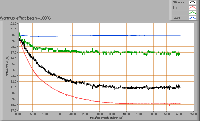 After switch on of a cold lamp, the effect of heating up of the lamp is measured on illuminance E_v [lx], color temperature CT or correlated color temperature CCT [K], the lamppower P [W] and the luminous efficacy [lm/W].
