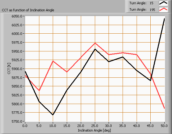 This plot shows per inclination angle the intensity measurement results for each turn angle at that inclination angle. There normally are differences in illuminance values for different turn angles. However for further calculations the averaged values will be used.