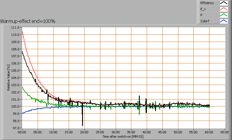 After switch on of a cold lamp, the effect of heating up of the lamp is measured on illuminance E_v [lx], color temperature CT or correlated color temperature CCT [K], the lamppower P [W] and the luminous efficacy [lm/W].