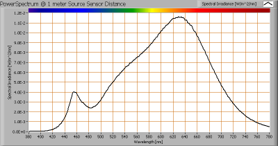 The spectral power distribution of this light bulb, energies on y-axis valid at 1 m distance.