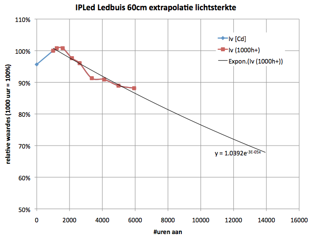 An extrapolation is done to get to the 70 % illuminance value. The illuminance value straight underneath the lamp is expected to be the good indicator of the total luminous flux. When this illuminance drops with 30 % then the luminous flux is expected to drop as well with 30 %. The assumption is here that the beam anlge and the radiation diagram remains the same. This has been checked, see also the initial table.