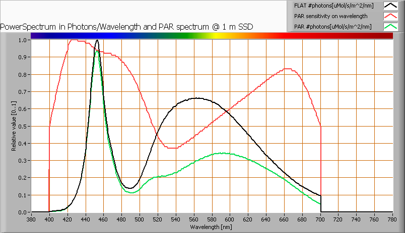 The photon spectrum, then the sensitivity curve and as result the final PAR spectrum of the light of this light bulb