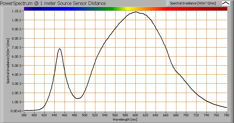 The spectral power distribution of this light bulb, energies on y-axis valid at 1 m distance.