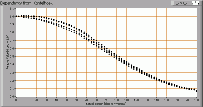 This plot shows per inclination angle the intensity measurement results for each turn angle at that inclination angle. There normally are differences in illuminance values for different turn angles. However for further calculations the averaged values will be used.