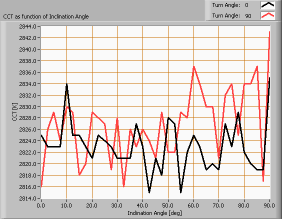 This color temperature is measured straight underneath the light bulb. Below a graph showing the color temperature for different inclination angles.