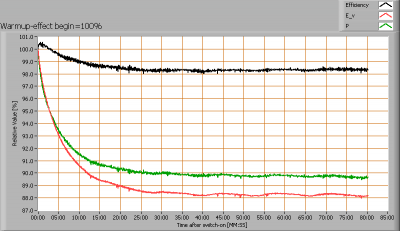 After switch on of a cold lamp, the effect of heating up of the lamp is measured on illuminance E_v [lx], the lamppower P [W] and the luminous efficacy [lm/W].