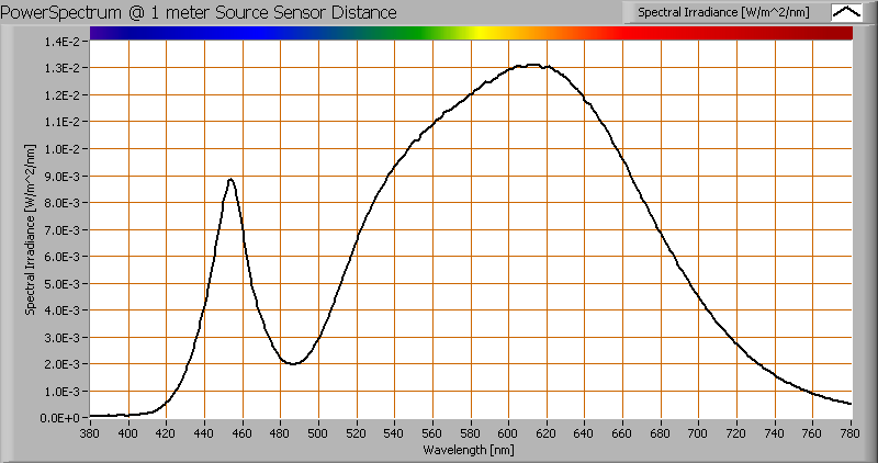 The spectral power distribution of this light bulb, energies on y-axis valid at 1 m distance.