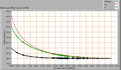 After switch on of a cold lamp, the effect of heating up of the lamp is measured on illuminance E_v [lx], the lamppower P [W] and the luminous efficacy [lm/W].
