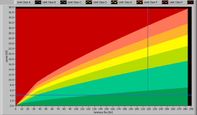 With the measurement results of the luminous flux and the consumed power the classification on energy efficacy of this lamp is calculated. This information is requested in the EU for certain household lamps, see also the OliNo site that explains for which lamps it is requested, how the label looks like and what information it needs to contain.