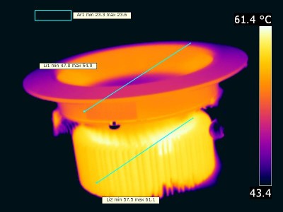 The temperature of the housing gets maximally about 38R degrees hotter than ambient temperature. Warm up effect: During the warmup time the illuminance varies during 20 minutes and decreases with 12 %. Voltage dependency: There is no (significant) dependency of the illuminance when the power voltage varies between 200 – 250 V AC. At the end of the article an additional photo. |