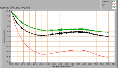 After switch on of a cold lamp, the effect of heating up of the lamp is measured on illuminance E_v [lx], the lamppower P [W] and the luminous efficacy [lm/W].