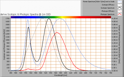 The power spectrum, sensitivity curves and resulting scotopic and photopic spectra (spectra energy content defined at 1 m distance).