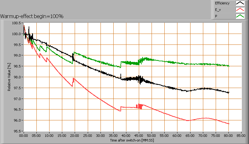 After switch on of a cold lamp, the effect of heating up of the lamp is measured on illuminance E_v [lx], the lamppower P [W] and the luminous efficacy [lm/W].