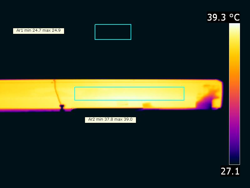 The temperature of the housing gets maximally about 15 degrees hotter than ambient temperature.