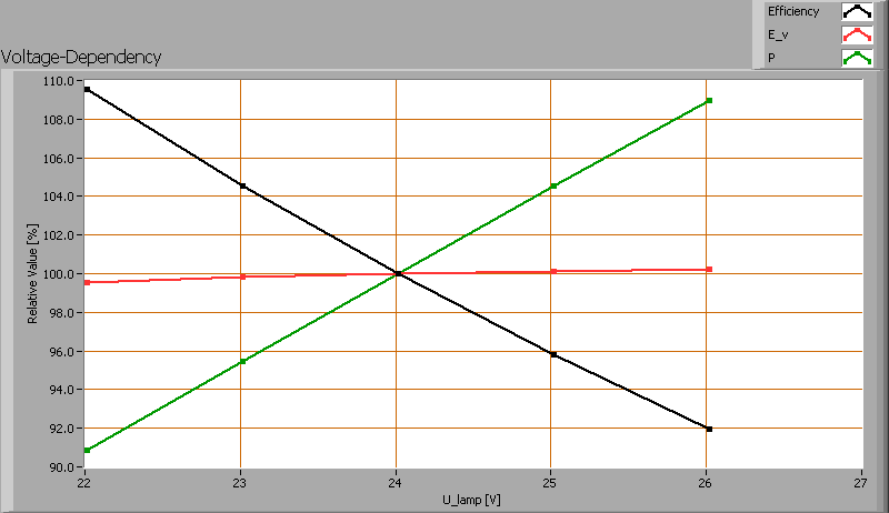 The dependency of a number of lamp parameters on the lamp voltage is determined. For this, the lamp voltage has been varied and its effect on the following light bulb parameters measured: illuminance E_v [lx], the lamppower P [W] and the luminous efficacy [lm/W] (this latter is estimated here by dividing the found E_v value by P).