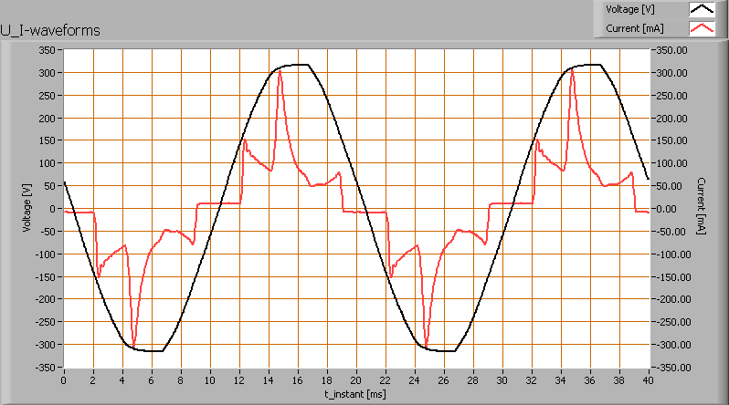 This current waveform has been checked on requirements posed by the norm IEC 61000-3-2:2006 (including up to A2:2009). See also the IEC 61000-3-2:2006 explanation on the OliNo website.