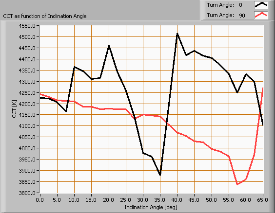 The color temperature is given for inclination angles up to 65 deg. Beyond that value the illuminance is so low (< 5 lux) that it has not been used for color determination of the light.