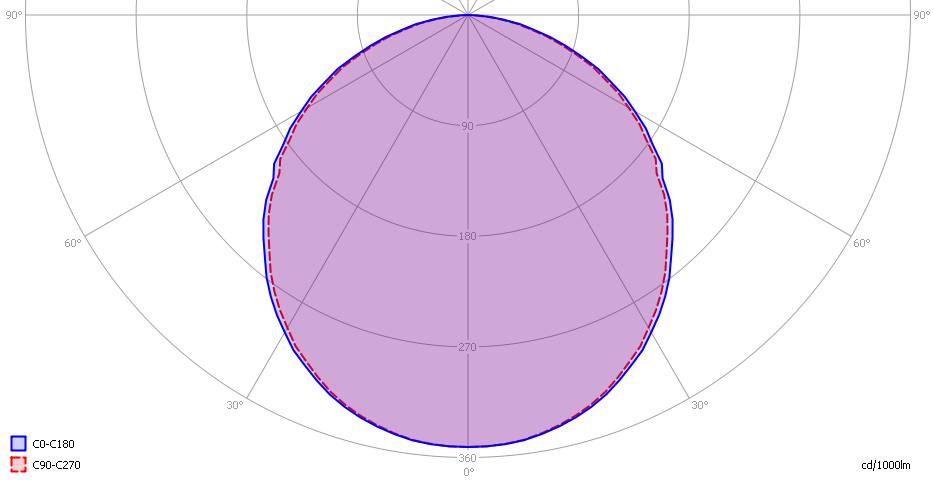 This radiation pattern is the average of the light output of the light diagram given earlier. Also, in this graph the luminous intensity is given in Cd.
