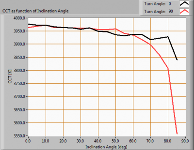 The color temperature is given for inclination angles up to 85 deg. Beyond that value the illuminance is so low (< 5 lux) that it has not been used for color determination of the light.