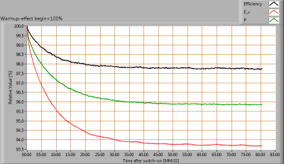 After switch on of a cold lamp, the effect of heating up of the lamp is measured on illuminance E_v [lx], the lamppower P [W] and the luminous efficacy [lm/W].