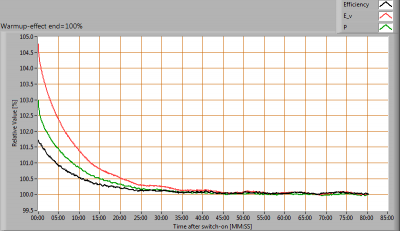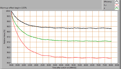 After switch on of a cold lamp, the effect of heating up of the lamp is measured on illuminance E_v [lx], the lamppower P [W] and the luminous efficacy [lm/W].