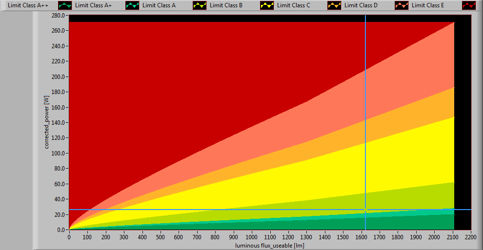 With the measurement results of the luminous flux and the consumed power the classification on energy efficacy of this lamp is calculated. This information is requested in the EU for certain household lamps, see also the OliNo site that explains for which lamps it is requested, how the label looks like and what information it needs to contain.