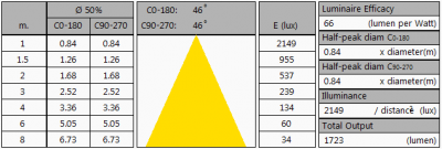 Please note that this overview table makes use of calculations, use this data with care as explained on the OliNo site. E (lux) values are not accurate, when within 5 x 134 mm (maximal luminous size, eventually diagonally measured)= 670 mm. Within this distance from the lamp (data given in red), the measured lux values will be less than the computed values in this overview as the measurements are then within the near field of the lamp.