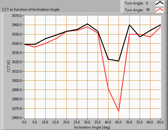 This color temperature is measured straight underneath the light bulb. Below a graph showing the color temperature for different inclination angles.