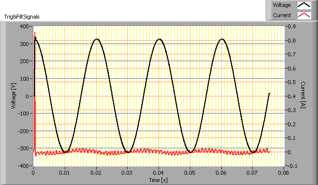 The inrush current has been measured for different voltage start angles; from 0 – 170 degrees with a 10 degrees step. The current- and voltage values have been acquires at a sample speed of 39.9 kS/s. Then this data has been fed into a second order 2kHz low pass Butterworth filter. This removes the current spikes that do not represent relevant values.