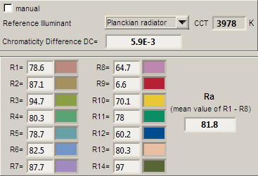 Herewith the image showing the CRI as well as how well different colors are represented (rendered). The higher the number, the better the resemblance with the color when a black body radiator would have been used (the sun, or an incandescent lamp). Practical information and also some critics about the CRI can be found on the OliNo website.