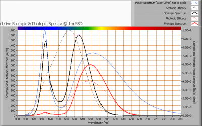 The power spectrum, sensitivity curves and resulting scotopic and photopic spectra (spectra energy content defined at 1 m distance).