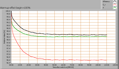 After switch on of a cold lamp, the effect of heating up of the lamp is measured on illuminance E_v [lx], the lamppower P [W] and the luminous efficacy [lm/W].