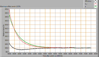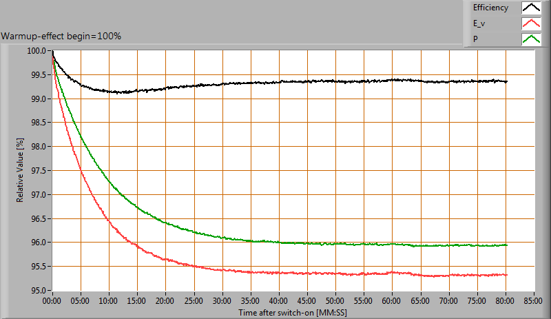 After switch on of a cold lamp, the effect of heating up of the lamp is measured on illuminance E_v [lx], the lamppower P [W] and the luminous efficacy [lm/W].