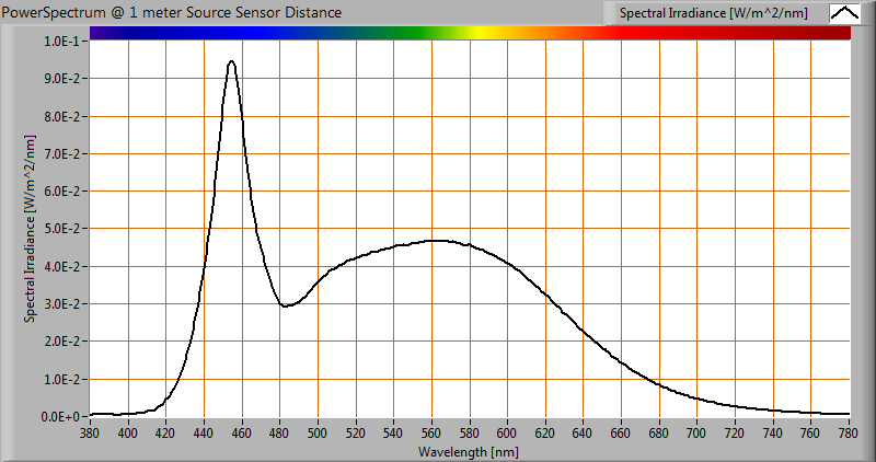The spectral power distribution of this light bulb, energies on y-axis valid at 1 m distance.
