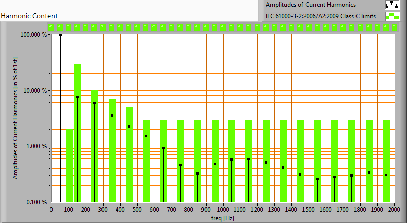 Harmonics in the current waveform and checked against IEC61000-3-2:2006 and A2:2009