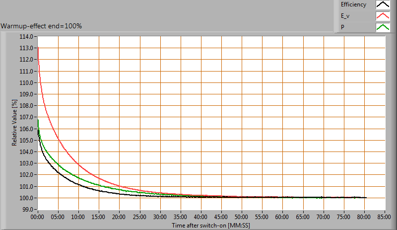 After switch on of a cold lamp, the effect of heating up of the lamp is measured on illuminance E_v [lx], the lamppower P [W] and the luminous efficacy [lm/W].