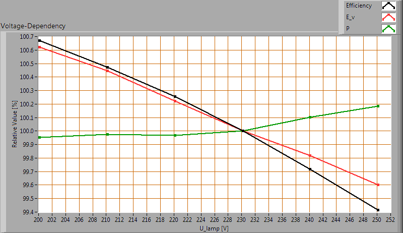 After switch on of a cold lamp, the effect of heating up of the lamp is measured on illuminance E_v [lx], the lamppower P [W] and the luminous efficacy [lm/W].