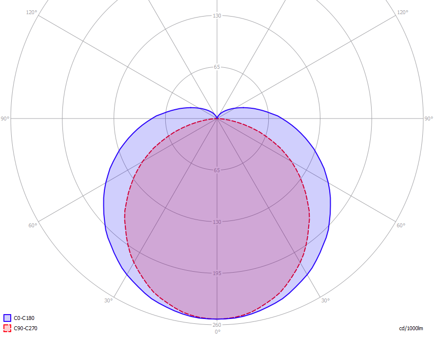 This radiation pattern is the average of the light output of the light diagram given earlier. Also, in this graph the luminous intensity is given in Cd.