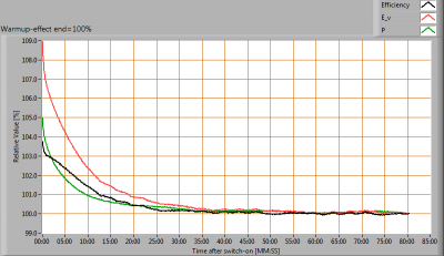 the variation in efficacy during the warming up is -3 %. A very high negative value indicates a significant decrease for instance due to heating up of the lamp (decrease of lifetime).