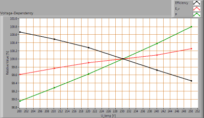 The dependency of a number of lamp parameters on the lamp voltage is determined. For this, the lamp voltage has been varied and its effect on the following light bulb parameters measured: illuminance E_v [lx], the lamppower P [W] and the luminous efficacy [lm/W] (this latter is estimated here by dividing the found E_v value by P).