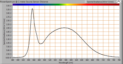 The spectral power distribution of this light bulb, energies on y-axis valid at 1 m distance.